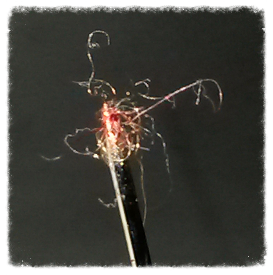 This Photo #3 to Right shows Fibrelos Strands with Fibrelos Blood Clots just removed from a Patient's body, then placed in tap water, showing the Fibrelos in a more natural state. It's easy to see the Fibrelos Blood Clots. It's easier to see the Fibrelos in water. Floating in water allows Fibrelos to show different and sometimes subtle movements.