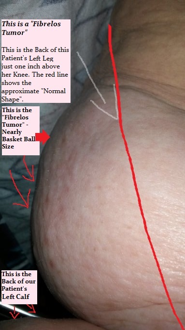Next, in Photo #C, this shows a ©Pin Prick Shunt in the back of our Founder's Left Leg just below her left knee in the calf zone. The reason for starting the shunt to begin with was due to backed up pressure caused by Fibrelos Fluid taking over her Left Leg. This photo was taken on 10-17-2015. This shunt was done during the time-frame of the Fibrelos Basketball Tumor. Walking, sitting, trying to move with all that fluid in your leg(s) is extremely difficult, as seen with Fibrelos Elephant Leg, it's cumbersome to live with.